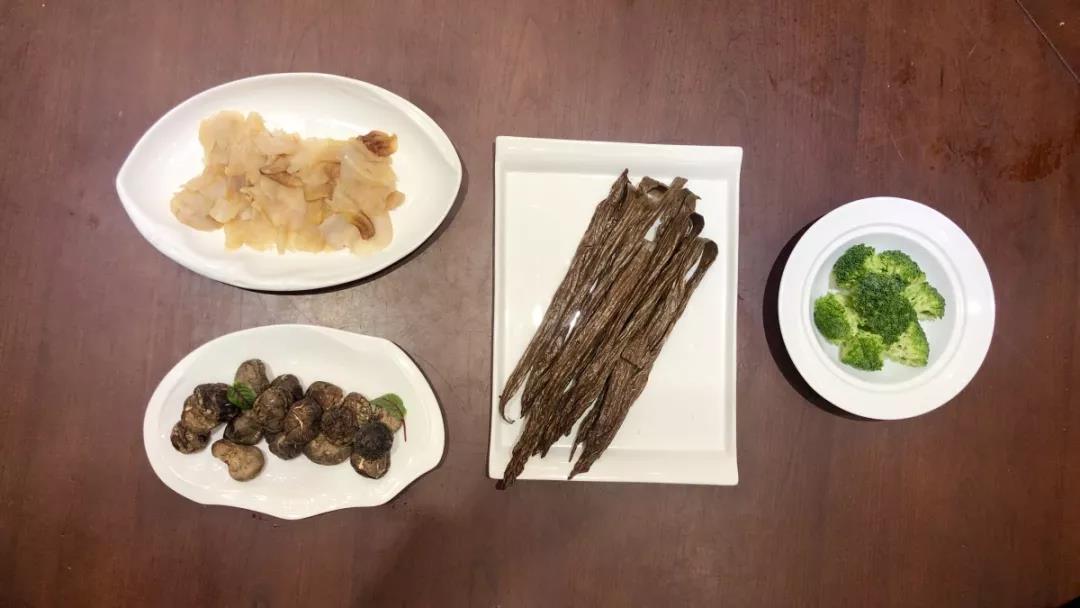北菇、象拔蚌(小)、黑豆腐竹、西蓝花、鲍鱼汁