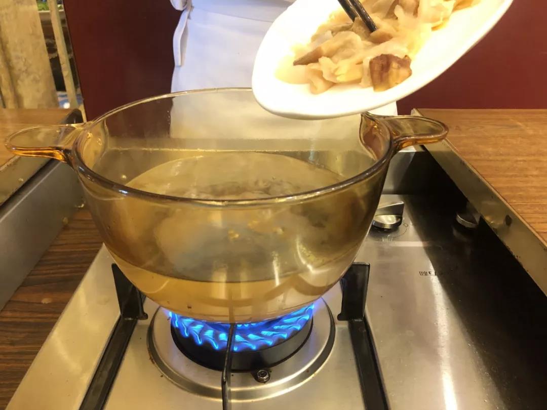 Step3:象拔蚌洗净切成薄片下锅快速焯水,约30~40秒捞出(不宜过久,否则肉质会变硬)。