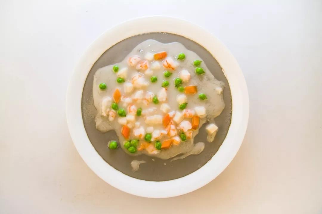 虾仁、带子粒、豌豆粒、红萝卜丁、黑豆腐、蛋清
